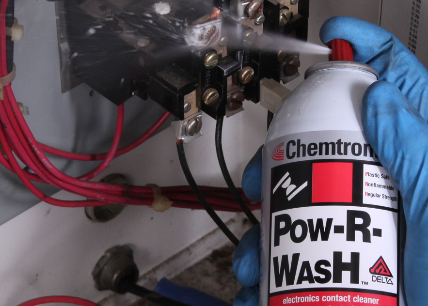 Pow-R-Wash™ Delta electronics contact cleaner is a highly effective solvent cleaner for electrical and electronic components and assemblies. Nonflammable, and compatible with most metals and plastics found in electronic assemblies, it is safe on energized equipment, fast drying and has excellent solvency for oil, grease, dirt.